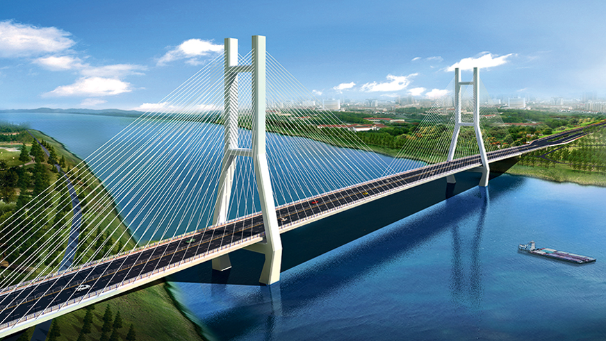 濟南黃河公路大橋采用雙塔雙索面等高鋼桁架斜拉橋結構形式,全長 1028 米,主跨 488 米,主塔高 168 米,主梁采用整體式鋼桁梁斷面,上下兩層,上層橋面為雙向八車道公路橋面,下層為雙線軌道橋面。濟南黃河公路大橋是貫徹落實黃河流域生態保護和高質量發展的國家戰略深入實施的重大項目,是加快濟南“擁河發展”、奮力開啟“黃河時代”的重要保障。